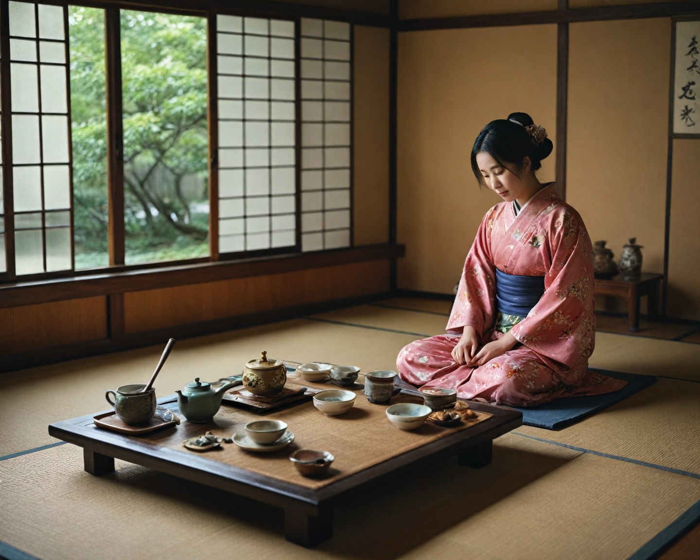 Recepção dos Convidados: Os convidados são conduzidos a uma sala de espera onde são instruídos sobre a etiqueta a ser seguida. Em seguida, são convidados a entrar na sala de chá propriamente dita.